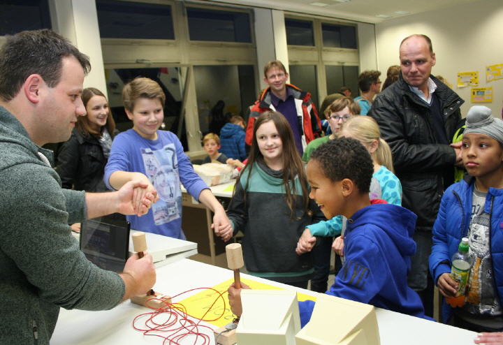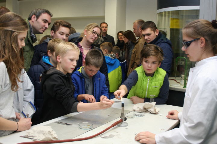 Interessiert verfolgten viele Eltern mit ihren Kindern vor allem die naturwissenschaftlichen Experimente: Im Chemieraum wurden Münzen mit einer Legierung veredelt und im Physikraum demonstrierte Lehrer Thomas Kisker zur Freude der jungen Besucher, dass wir Menschen gute Stromleiter sind: Denn selbst durch mehrere Menschen, die sich an den Händen halten, fließt der Strom und ließ eine Lautsprecherbox Musik spielen.