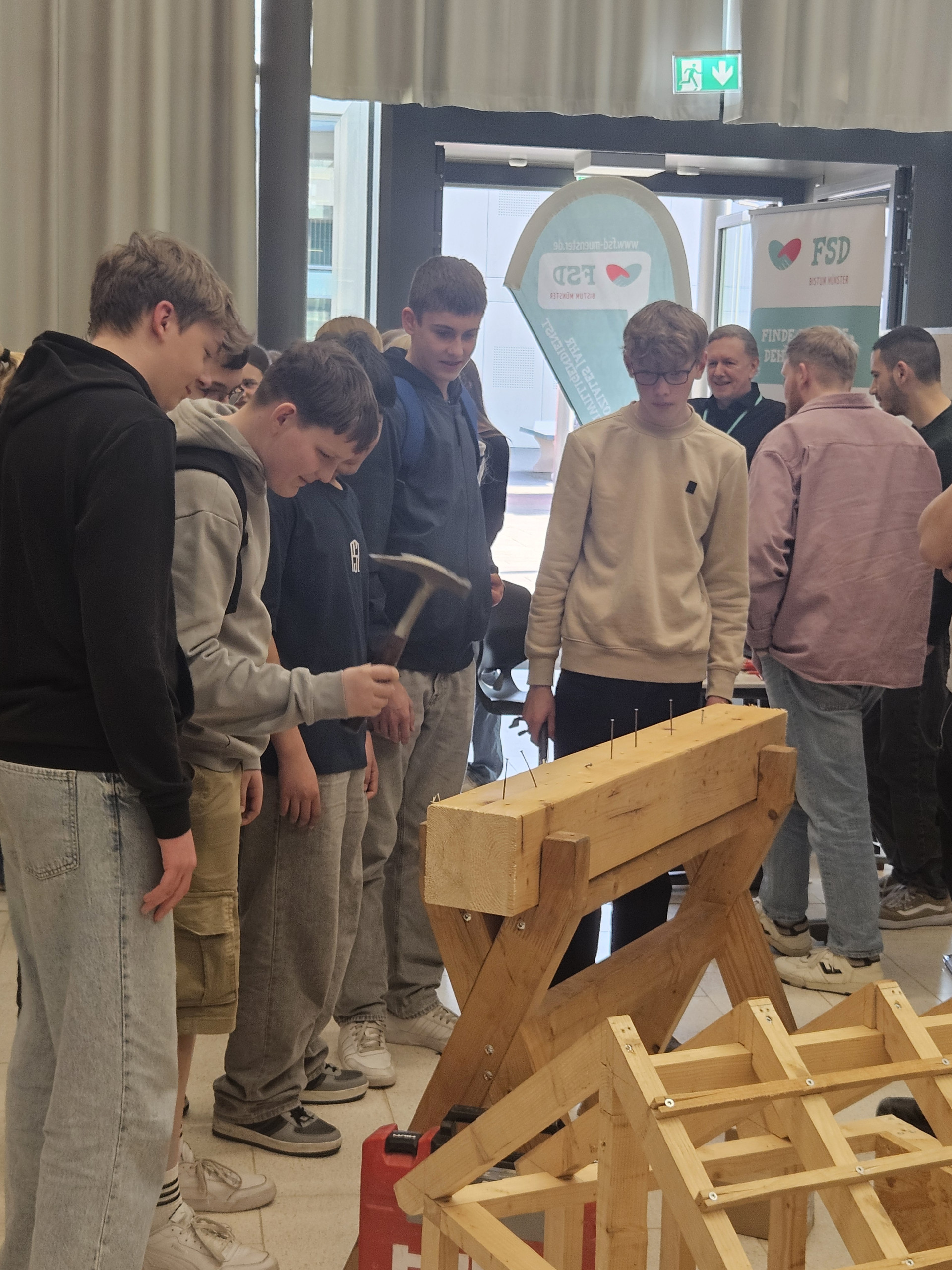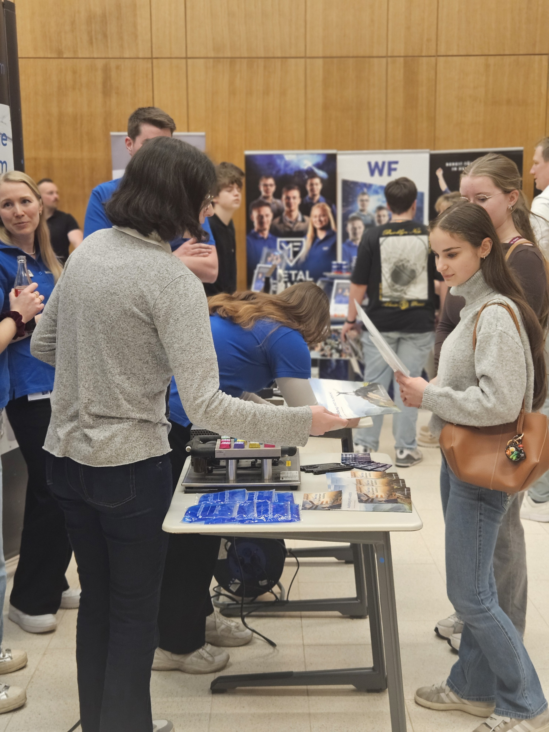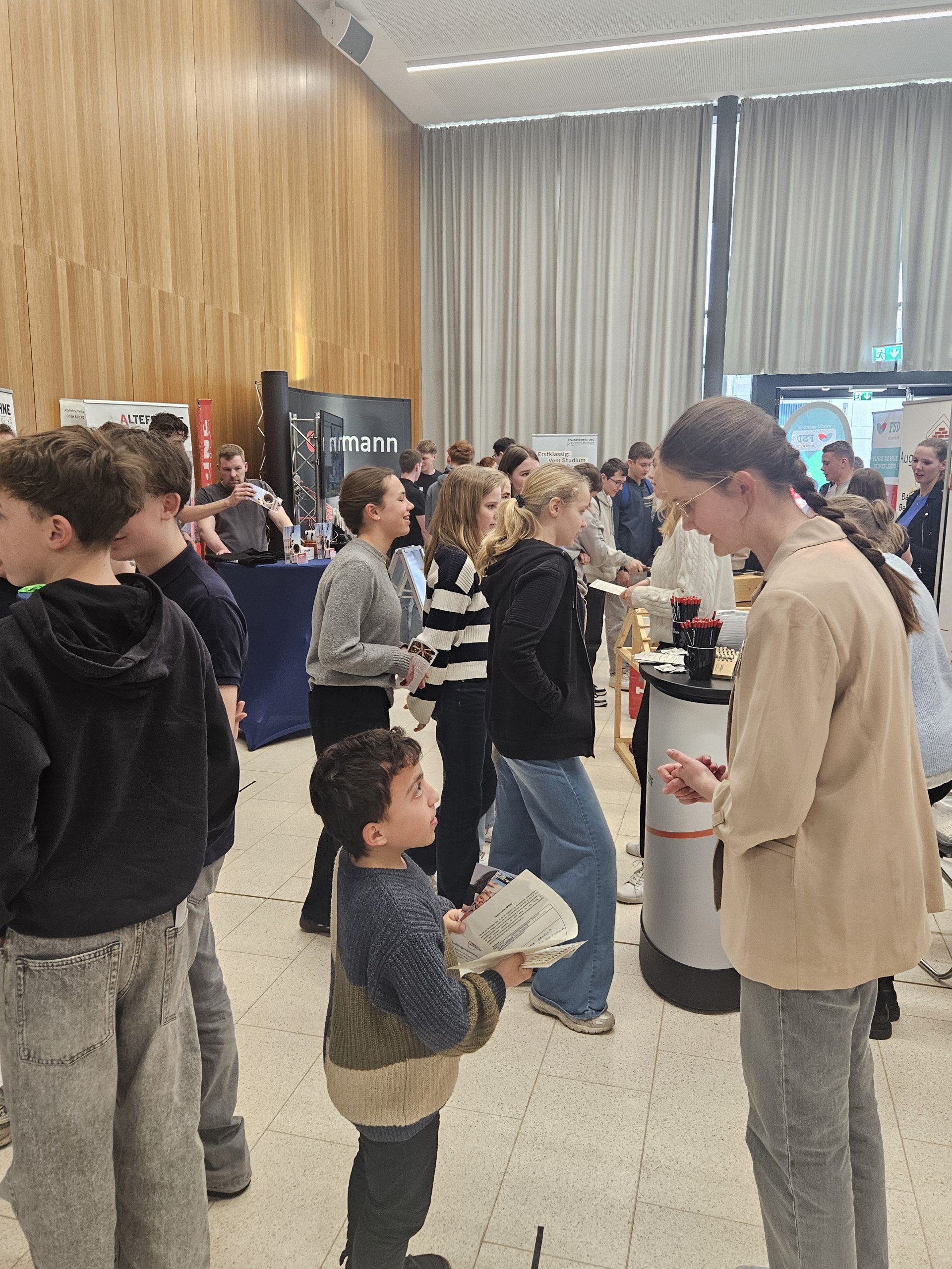Die Nachfrage war wieder riesig. Unter der Regie von Berufskoordinator Thomas Kisker bauten in diesem Jahr 42 Betriebe und auch soziale Einrichtungen in der Aula der Bischöflichen ihre Informationsstände auf und standen für die Gespräche mit den Schülerinnen und Schülern der achten und neunten Klassen zur Verfügung. In den persönlichen Begegnungen auf Augenhöhe mit den Auszubildenden, die zum Teil selbst einmal an der BRS gepaukt hatten, bekamen die Schülerinnen und Schüler so die Möglichkeit, sich über Ausbildungswege und Praktikumsmöglichkeiten zu informieren. Auch viele Eltern nutzten die Gelegenheit, ihre Kinder zu begleiten und sich über zukünftige Möglichkeiten zu informieren. Neben den Informationsständen gaben die Betriebe und Firmen in Kurzvorträgen Einblick in ihre Ausbildungsangebote. „Diese Veranstaltung ist eine tolle Gelegenheit für unsere Schülerinnen und Schüler, in vertrauter Umgebung niederschwellig in Kontakt mit der Berufswelt zu kommen“, sagte Schulleiterin Claudia Tennstedt, die sich besonders über das große Interesse auch in der Elternschaft an dem Angebot freute.